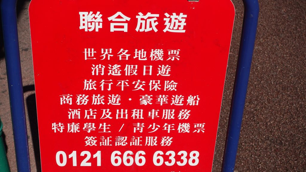 The next business is a travel company which can be contacted on the phone number 0121 666 6338. The phone number appears here on the company signboard, which details the services that they offer in Chinese. The windows of the shopfront are choc-a-bloc with holiday packages and also a few property deals.